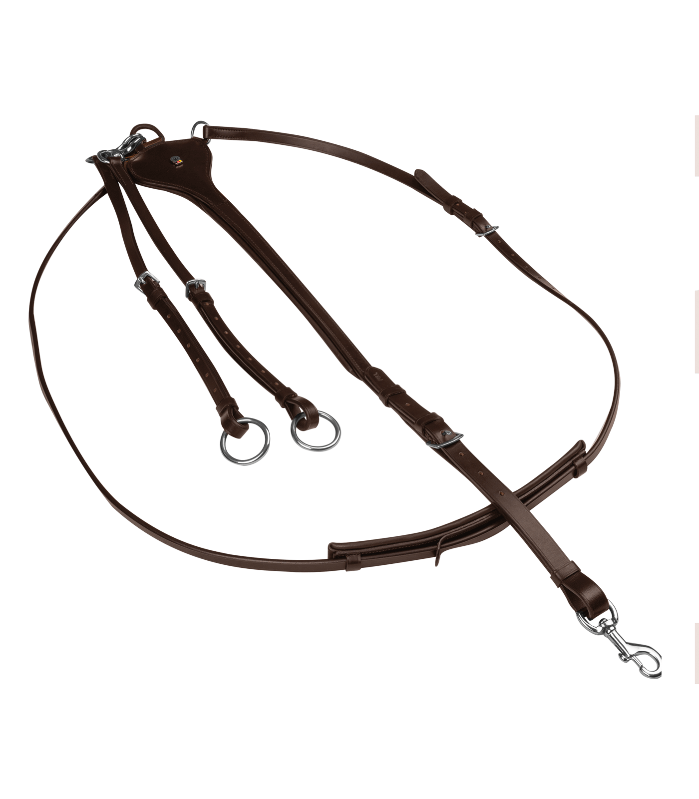 Martingala de suave cuero con suave acolchado en la cruz. Horquilla de martingala de quita y pon, así como regulable en la longitud. Para fijar a la cincha con toda comodidad utilizando un mosquetón de carabina. Con hebillas de acero inoxidable.