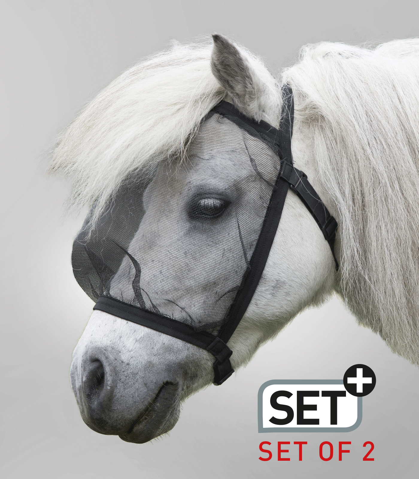En práctico set de dos unidades Máscara antimoscas ligera con inserción elástica para proteger los sensibles ojos del caballo contra los molestos insectos. Tejido fino y fuerte de red para una protección segura contra los pequeños insectos y, al mismo tiempo, máxima libertad de movimientos del ojo. El ahogadero y la muserola se pueden regular de modo flexible y así adaptar a la medida a la cabeza del caballo. 2 piezas