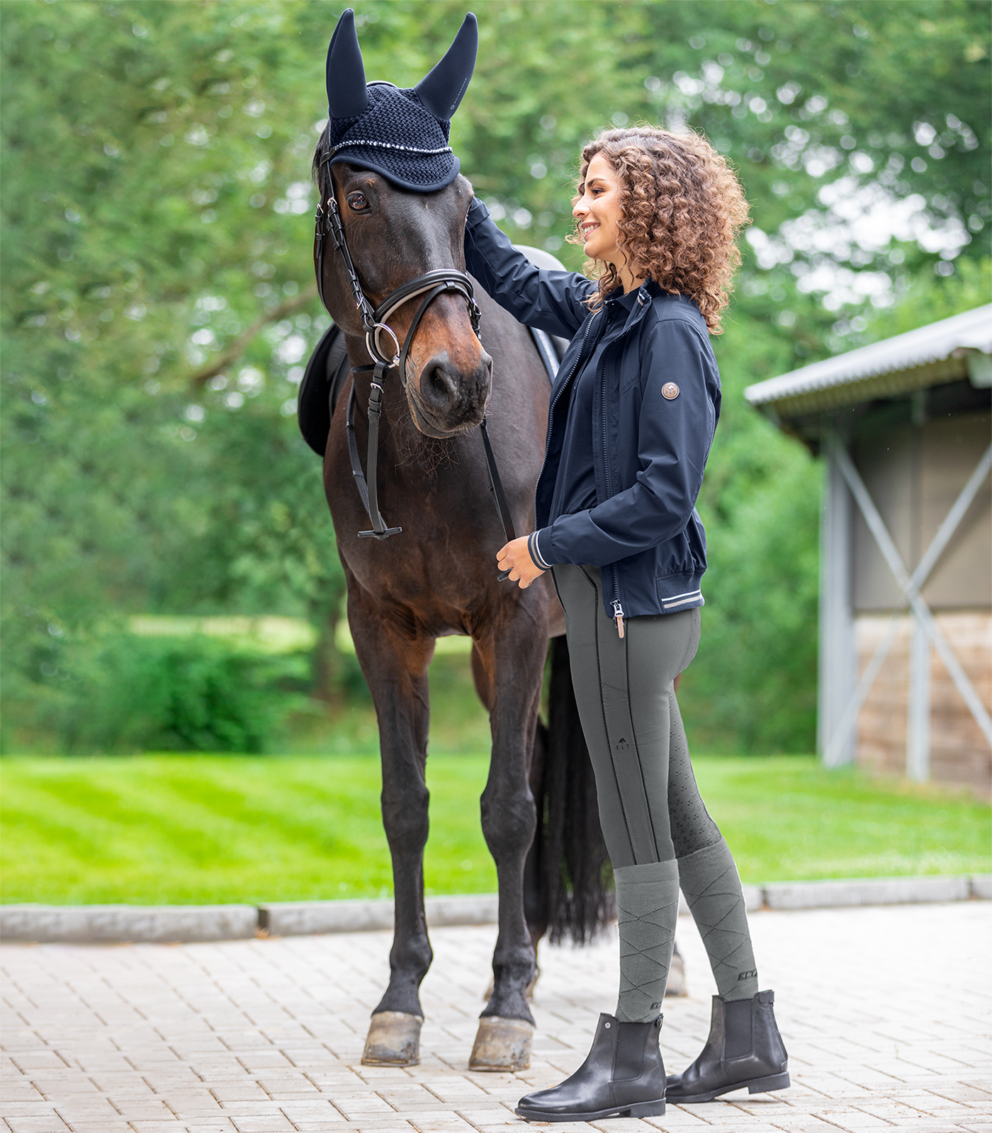 – Pantalones de equitación de plena tendencia – Inserción completa de silicona – Bajo pierna elástico – Transpirable – Material repelente al agua – Bi-elástico – Sintético – Bolsillo lateral para el móvil – Bolsillos con cremallera en la parte delantera – Detalles de brillo – Etiqueta de metal E·L·T de alta calidad Material: 62% poliéster, 33% viscosa, 5% elastano