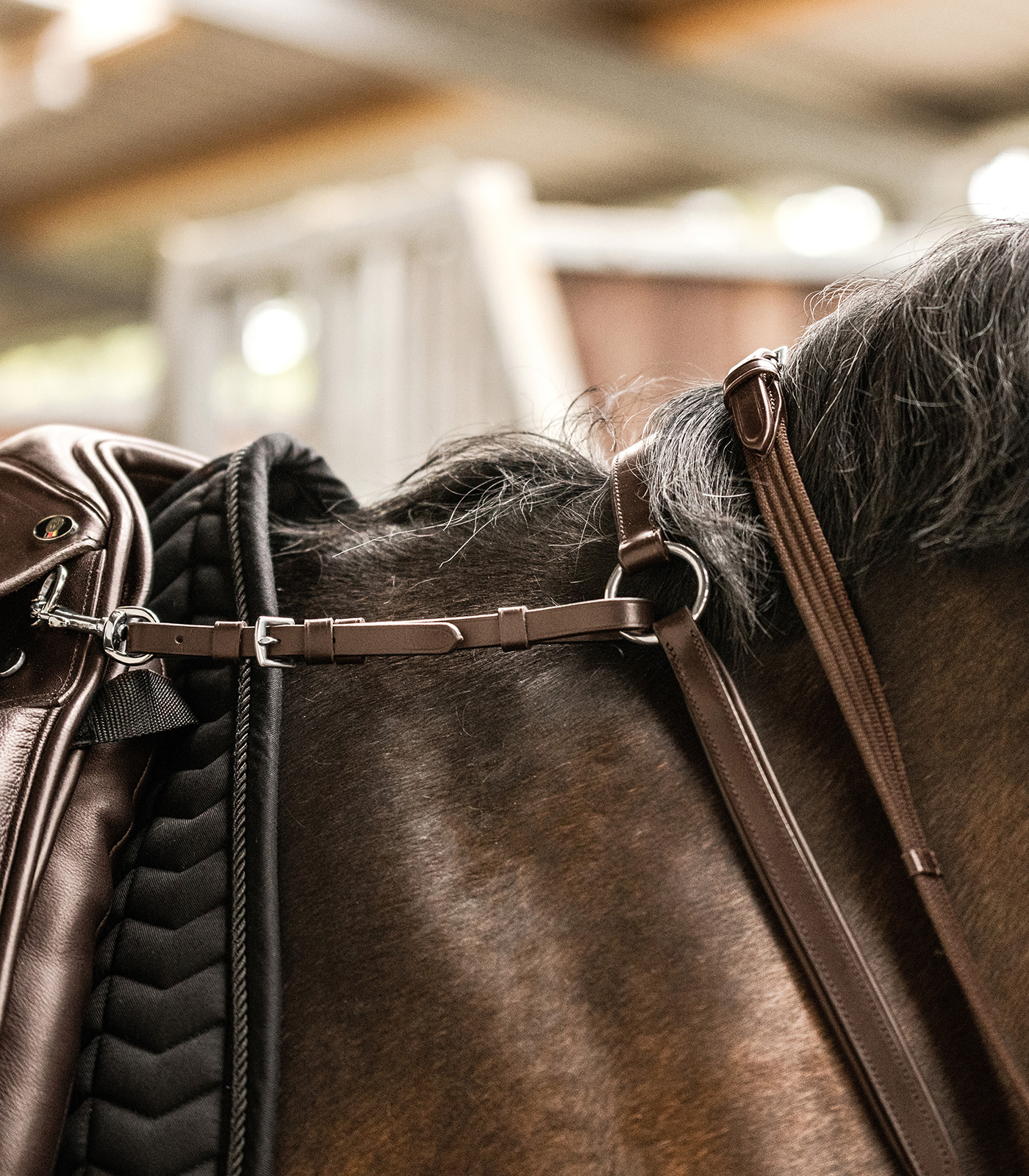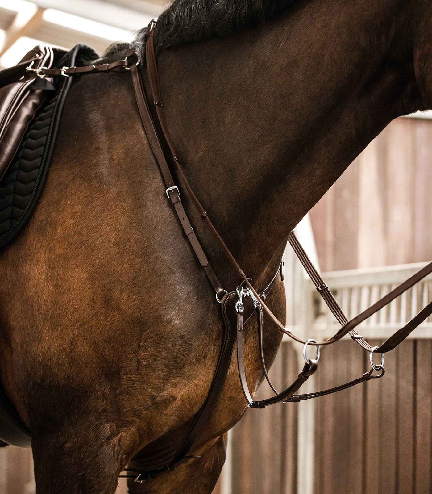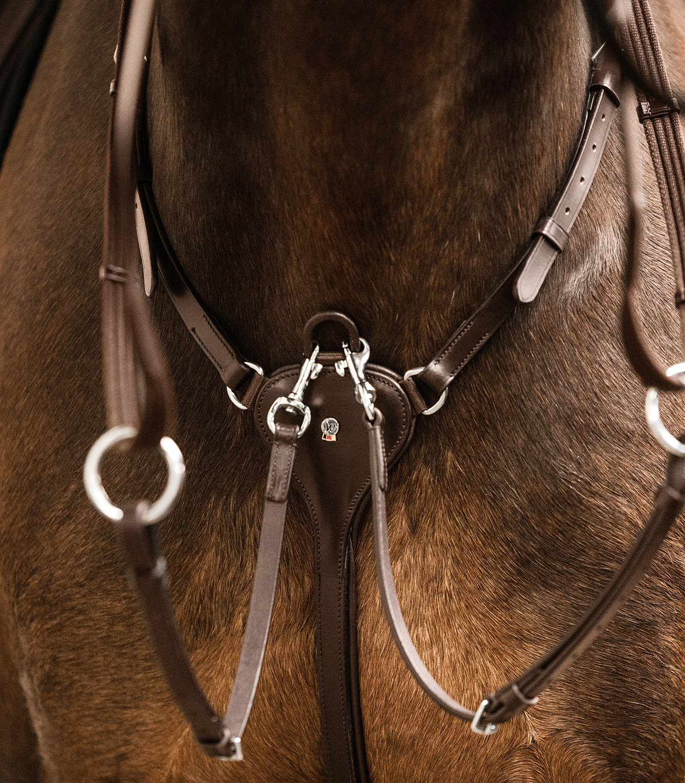 Pechopetral con puente de cuero suave que impide que la silla se pueda deslizar hacia atrás. El pechopetral se puede fijar a la silla y a la cincha con toda comodidad utilizando los mosquetones de carabina. Con suave acolchado en el pecho y en la cruz. Regulable en el tamaño, así como con horquilla de martingala de quita y pon. Con hebillas de acero inoxidable.