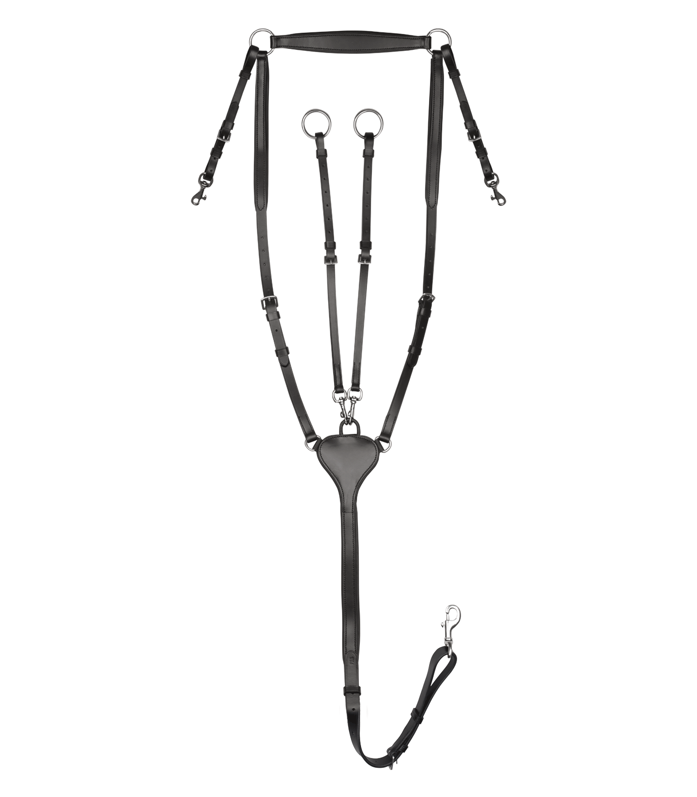 Pechopetral con puente de cuero suave que impide que la silla se pueda deslizar hacia atrás. El pechopetral se puede fijar a la silla y a la cincha con toda comodidad utilizando los mosquetones de carabina. Con suave acolchado en el pecho y en la cruz. Regulable en el tamaño, así como con horquilla de martingala de quita y pon. Con hebillas de acero inoxidable.