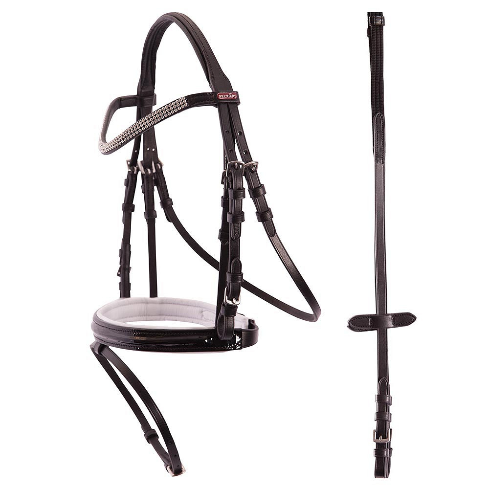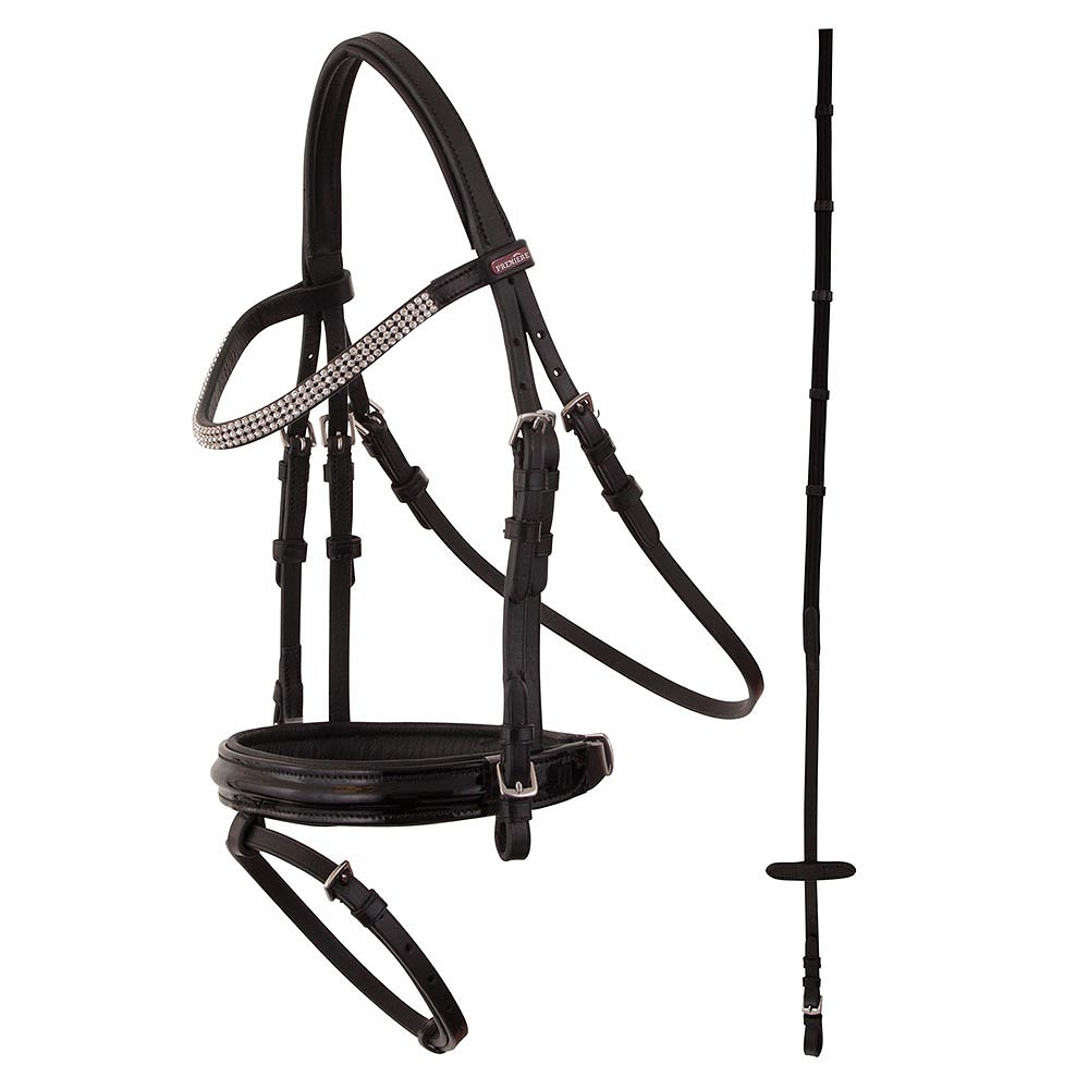 Premiere Bridle Ajaccio, brida simétrica con un tocado formado anatómicamente con forro acolchado suave, que se corta en las orejas para obtener más libertad. La banda de cejas ligeramente curva tiene una cadena de plata de 3 filas con diamantes de imitación y forro de cuero suave. Su banda de nariz de cuero de patente flash está elevada con forro acolchado suave. La brida tiene accesorios de acero inoxidable. El rindo web incluido tiene paradas de mano y rindad.