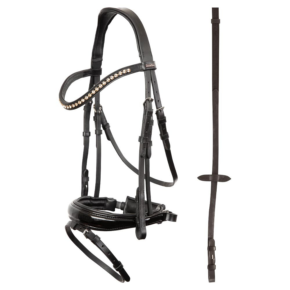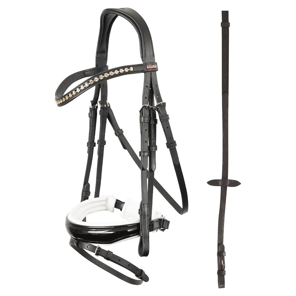 Premiere Bridle Brest, el Premiere Bridle Brest está hecho de cuero suave y flexible y tiene una forma anatómica, lo que garantiza un buen ajuste y una comodidad óptima para el caballo. El tocado de forma anatómica tiene un forro suave con relleno de forma media y se corta en las orejas. La banda nasal tiene una forma anatómica y se le proporciona un revestimiento elevado redondo bien acolchado y una almohadilla de barbilla ancha suavemente acolchada. La banda para la nariz está con estilo con cuero de patente y la banda de cejas ligeramente curva está incrustada con una cadena de plata con diamantes de imitación brillantes en el color melocotón de la albahaca. Viene con riendas contra el deslizamiento con paradas de mano.