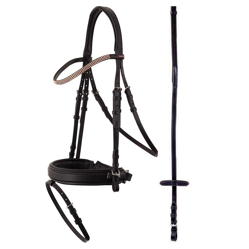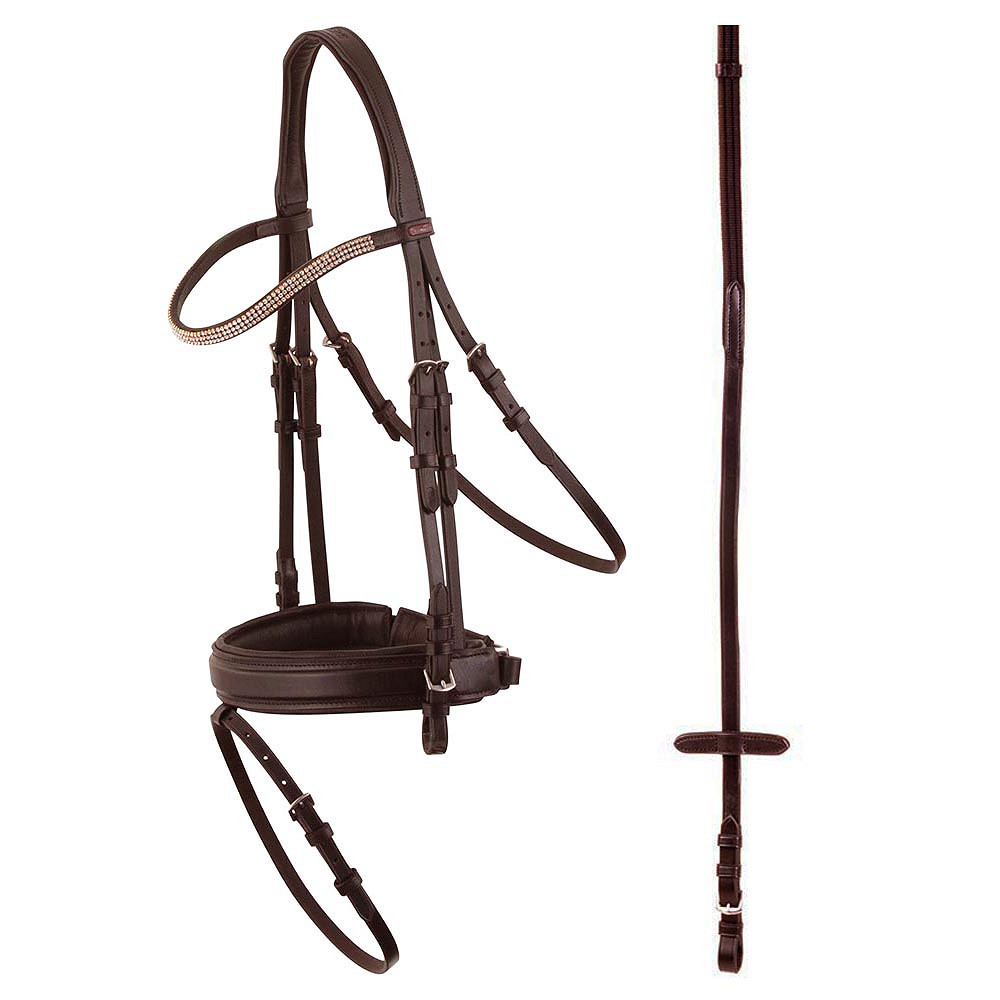 Premiere Bridle Dijon, brida simétrica con una corona de forma anatómica con forro acolchado suave, que se corta en las orejas. La banda de cejas ligeramente curva tiene una cadena dorada de 3 filas con diamantes de imitación blanca y tiene un forro de cuero suave. Su banda de nariz flash de manivela extra (± 4.5 cm) se eleva cuadrada con forro acolchado suave y tiene una almohadilla de la barbilla con forro acolchado suave. Los pómulos están equipados con el cierre de la hebilla. La brida tiene accesorios de acero inoxidable. El rindo web incluido tiene paradas de mano y rindad.