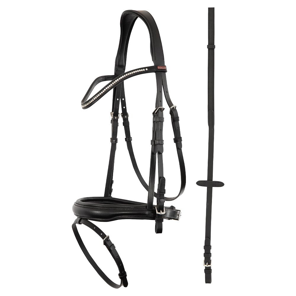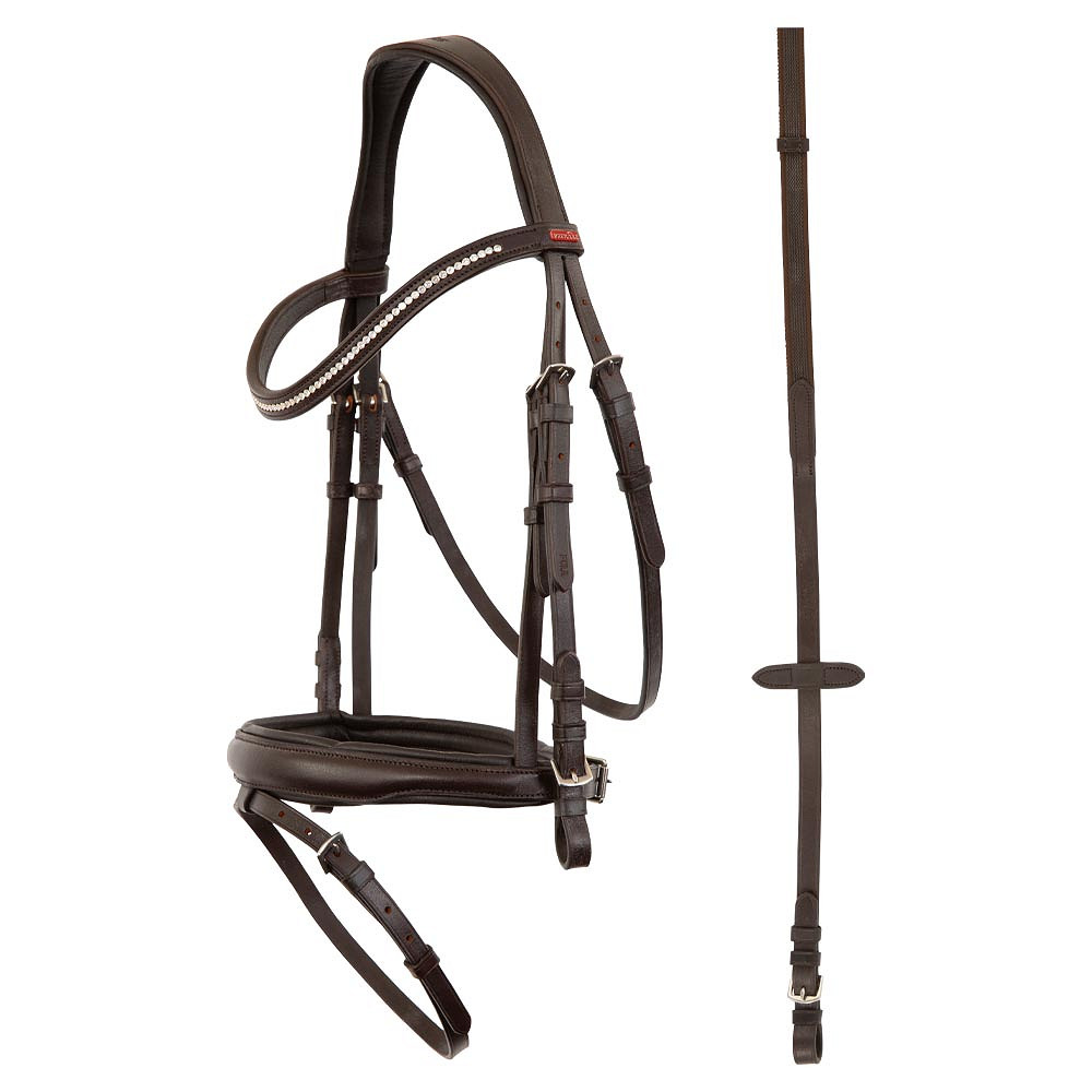 Premiere Brida Fontaine, esta brida de forma anatómica está diseñada con atención a la comodidad y los detalles brillantes. La principal fontaine de brida está hecha de cuero suave y flexible. Esto garantiza un buen ajuste, una mejor distribución de presión en la cabeza del caballo y mucha comodidad. El tocado y la banda nasal están suavemente forrados. La garganta se puede ajustar en ambos lados. Incluye: riendas de agarre con paradas de mano. La brida tiene una apariencia elegante gracias a la banda de cejas ligeramente con diamantes de imitación pequeños y graciosos.