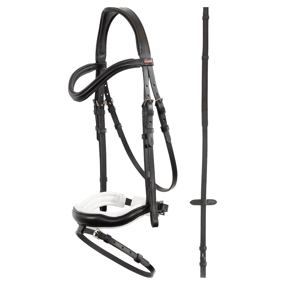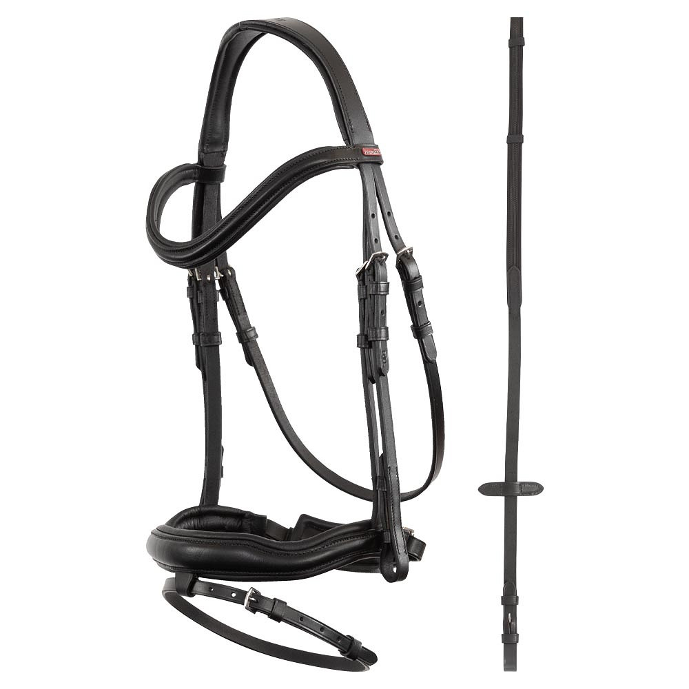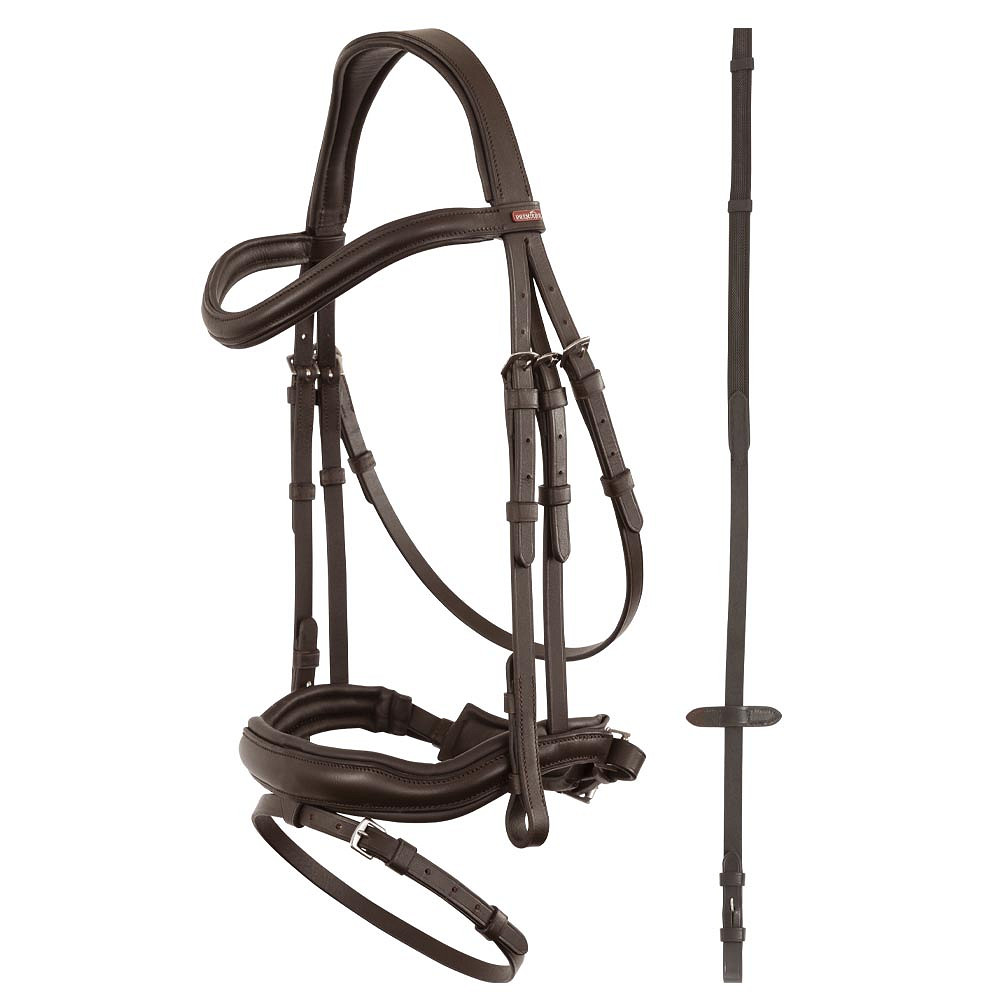 Premiere Bridle Lalevade, • En forma anatómica para un ajuste perfecto • Cómoda cómoda con un aspecto clásico • Incluye la información del producto de las riendas sin deslizamiento: esta cómoda puente de premiación está hecha de cuero suave y cepal. tiene forma anatómica. Como resultado, la brida encaja perfectamente en la cabeza de los caballos y garantiza una buena distribución de presión. El tocado, la banda de nariz combinada y la almohadilla de la barbilla ancha están proporcionadas con un forro suave para una comodidad óptima. La banda de cejas curva y la banda de nariz elevada redonda tienen un aspecto tranquilo y suave. La brida viene con riendas anti-deslizamiento a juego.