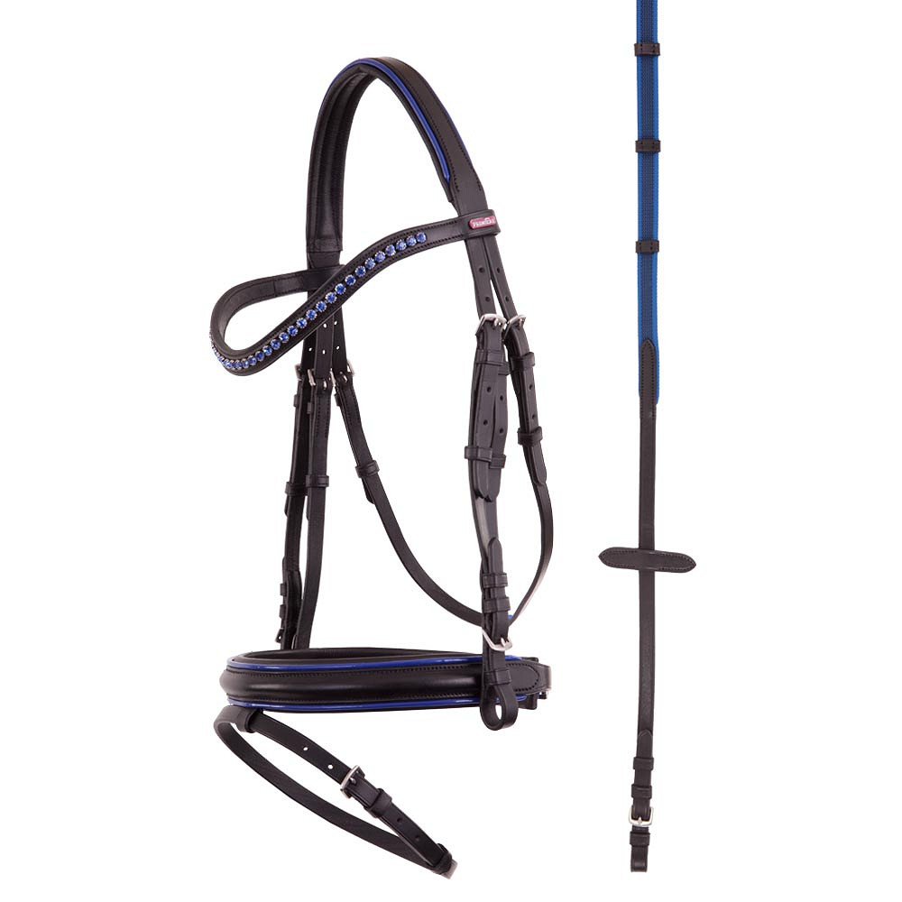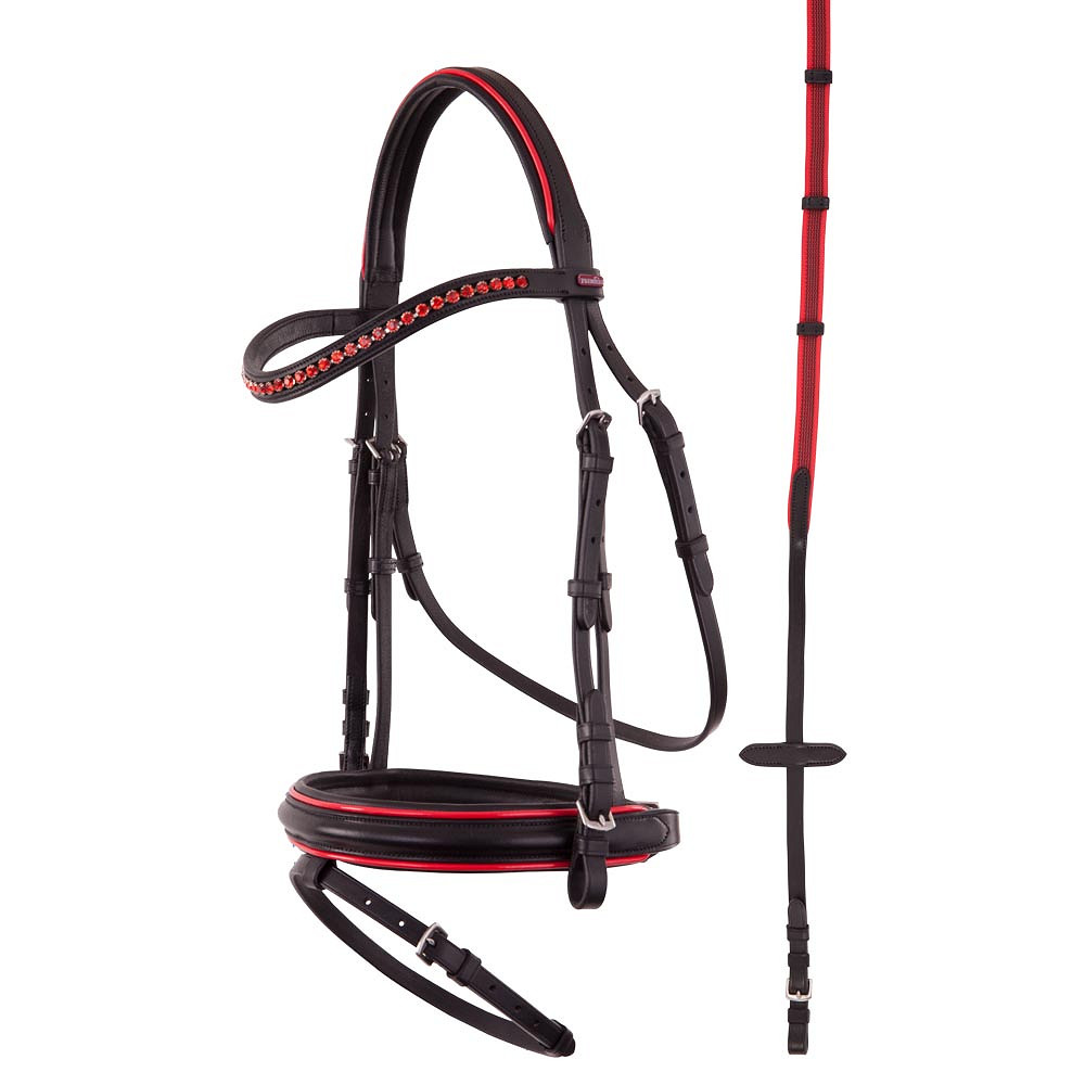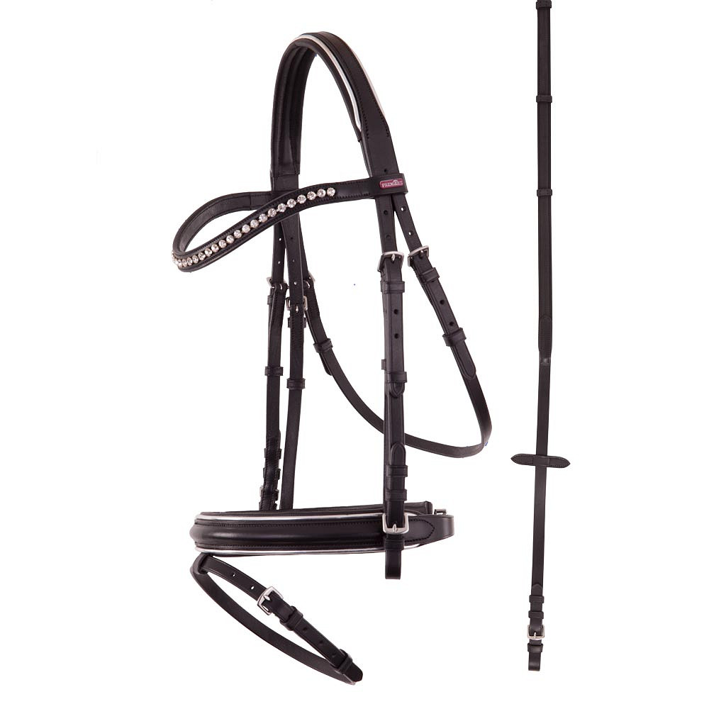 Premiere Bridle Nantes, esta brida simétrica está hecha de cuero bellamente terminado. Su tocado suavemente acolchado se corta alrededor de las orejas y se embellece con tuberías de cuero de patente en color de contraste. La banda de cejas curva está incrustada con diamantes de imitación de colores y presenta una cara de cuero suave. La garganta se puede ajustar en ambos lados y los pómulos están equipados con hebillas. La brida tiene una banda de nariz flash (aproximadamente 3.5 cm), que está adornada con tuberías de cuero de doble patente en color de contraste, similar al casco. La banda de la nariz está elevada y suavemente acolchada. La brida presenta accesorios brillantes de color plateado hechos de acero inoxidable y viene con riendas de agarre web en un color a juego. Las riendas se tejen con caucho para agarre adicional. Las riendas cuentan con la mano y la rindad de ruido y tienen 20 mm de ancho.