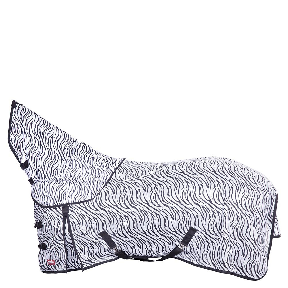 Premiere Fly Rug Combo Combo estampado de animales, alfombra con cubierta de cuello desmontable en cebra o diseño de leopardo. La investigación científica ha demostrado que un diseño de cebra atrae menos moscas. La alfombra de moscas presenta hebillas delanteras dobles, ajustables, espondas de hombro, salpicines cruzados ajustables, correas de piernas elásticas, una cuerda de filete y una solapa de cola. Su cubierta de cuello desmontable presenta dos cierres de velcro. Además, tiene un protector de encuesta de vellón. La cubierta del cuello se puede unir al cabestro mediante un cierre elástico de velcro y a la alfombra por medio de tres correas elásticas con clips de liberación fácil y rápida. Hecho de malla de poliéster al 100% con un revestimiento de 190T Taffeta Nylon.