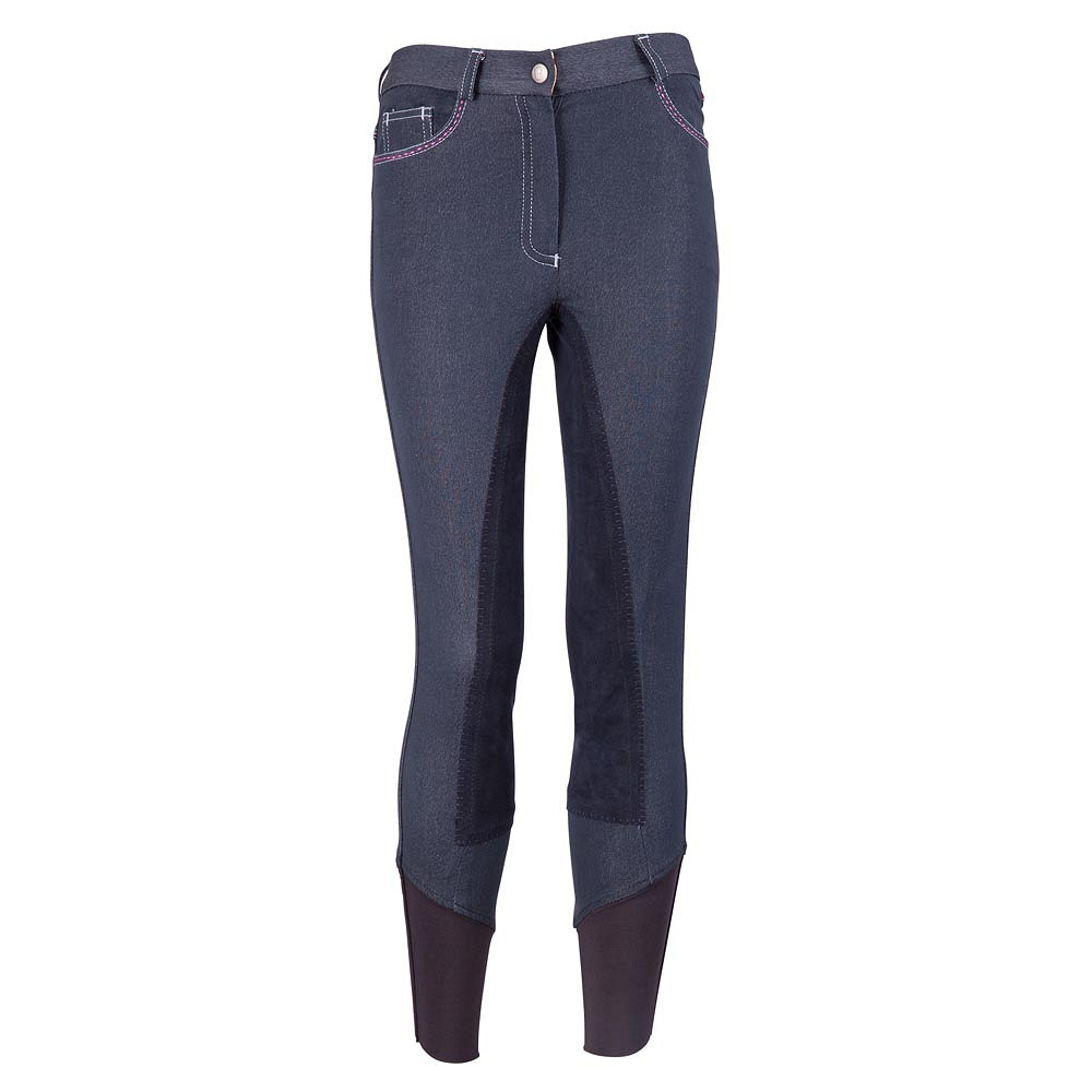 Premiere montar calzones Azalea para niños asiento de microfibra, jeans de ajuste cerrado para niños con calzones con bolsillos de jeans en la parte delantera y dos bolsillos de jeans zócalos en la parte posterior. Un bolsillo trasero presenta una aplicación de cabeza de caballos con diamantes de imitación. Los pantalones de equitación cuentan con un asiento completo de microfibra (MF). Las piezas elásticas de la parte inferior de la pierna proporcionan una comodidad óptima en las botas de montar. Hecho de 58% de algodón/ 34% de nylon/ 8% Lycra, calidad de los jeans tejidos con costuras contrastantes y costuras decorativas en los bolsillos y en la parte posterior.