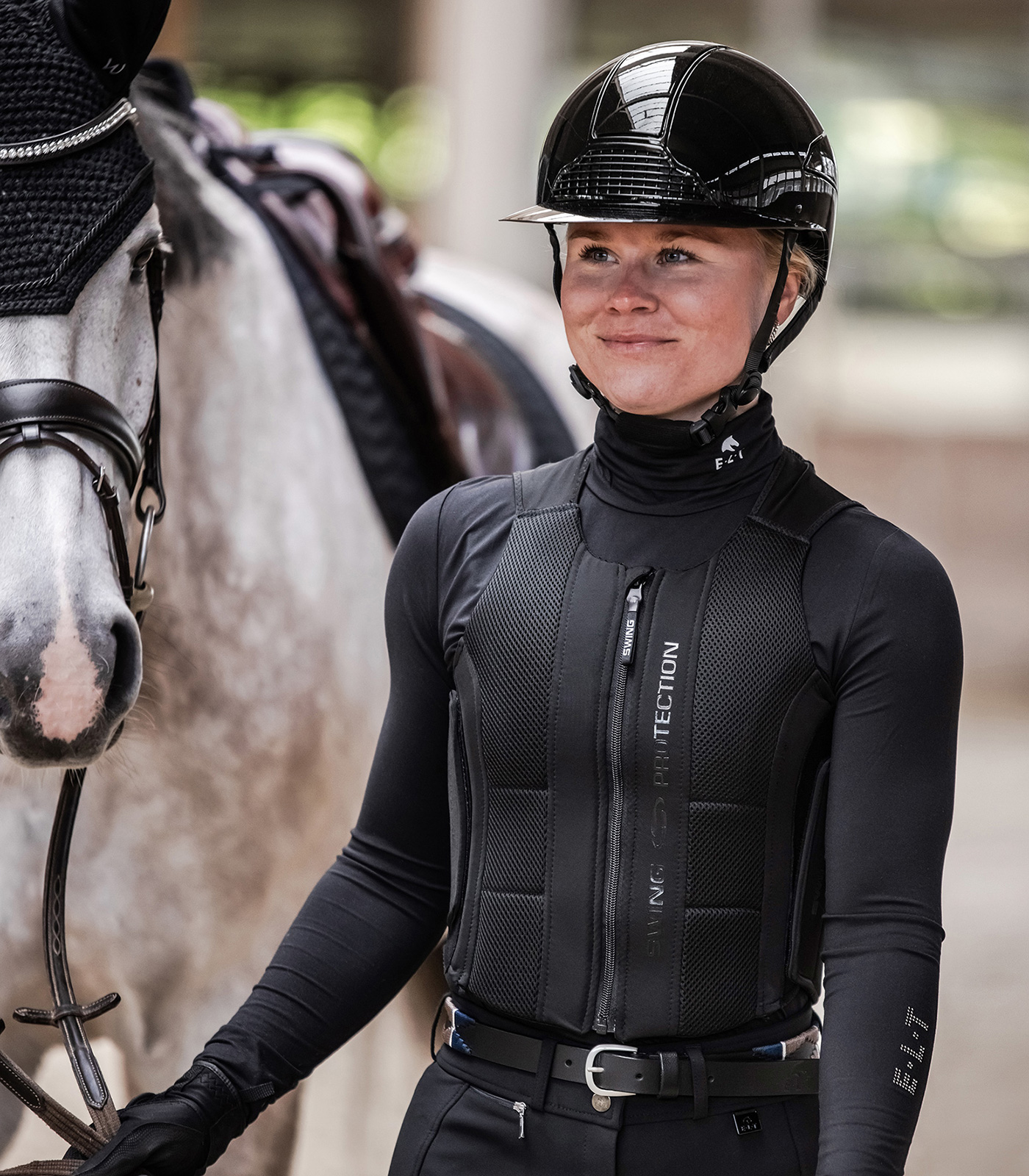 Desarrollado de acuerdo con la norma de seguridad actual, EN 1621-2:2014, Nivel 2, el SWING P24 Pro ofrece una protección excepcional durante la práctica de la equitación. Su panel protector SWING-Flex de 5 capas en la zona de la espalda es asombrosamente fino con tan solo 18 mm de grosor, lo que permite la máxima libertad de movimientos sin comprometer la seguridad. Las zonas de protección adicionales en la parte delantera y en la zona de las costillas refuerzan la protección y proporcionan una sensación de seguridad integral, independientemente de los retos a los que te enfrentes. Su corte aún más ergonómico y los cierres laterales de gancho y bucle garantizan un ajuste perfecto al cuerpo. El tejido elástico, ligero y transpirable asegura el máximo confort para que te puedas concentrar plenamente en el rendimiento mientras practicas la equitación. La cremallera frontal con el innovador tirador de seguridad SWING Safety Puller permite abrirla y cerrarla sin esfuerzo, incluso en caso de emergencia o cuando se llevan guantes. Te lo podrás poner y quitar en un santiamén usando la cremallera CMZ de alta calidad. Además, el protector es extraíble en la zona de la espalda, lo que facilita su limpieza y cuidado. Con la espaldera SWING P24 Pro estarás protegido de forma óptima y podrás disfrutar al máximo de la equitación. Seguridad, movilidad y confort combinados en un protector innovador para que puedas dar lo mejor de ti mismo, en cualquier momento y en cualquier lugar. – Protección para la columna vertebral certificada CE (según la norma europea UNE-EN 1621-2:2014, nivel 2) – Panel protector SWING-Flex de 5 capas – Sólo 18 mm de grosor – Corte ergonómico mejorado – Ajuste óptimo gracias a los cierres laterales de gancho y bucle – Tirador de seguridad SWING – Cremallera de alta calidad CMZ – Tejido elástico, ligero y transpirable para máximo confort Los protectores de espalda Swing protegen el cuerpo sin menoscabar el placer de cabalgar en libertad. El empleo de materiales high-tech permite la máxima libertad de movimientos. Te recordamos que en las pruebas de concurso completo y en terreno variado, la normativa alemana para concursos hípicos (LPO) impone el uso de un protector de este tipo de acuerdo con las normas EN 13158, nivel 3. Declaración de Conformidad CE