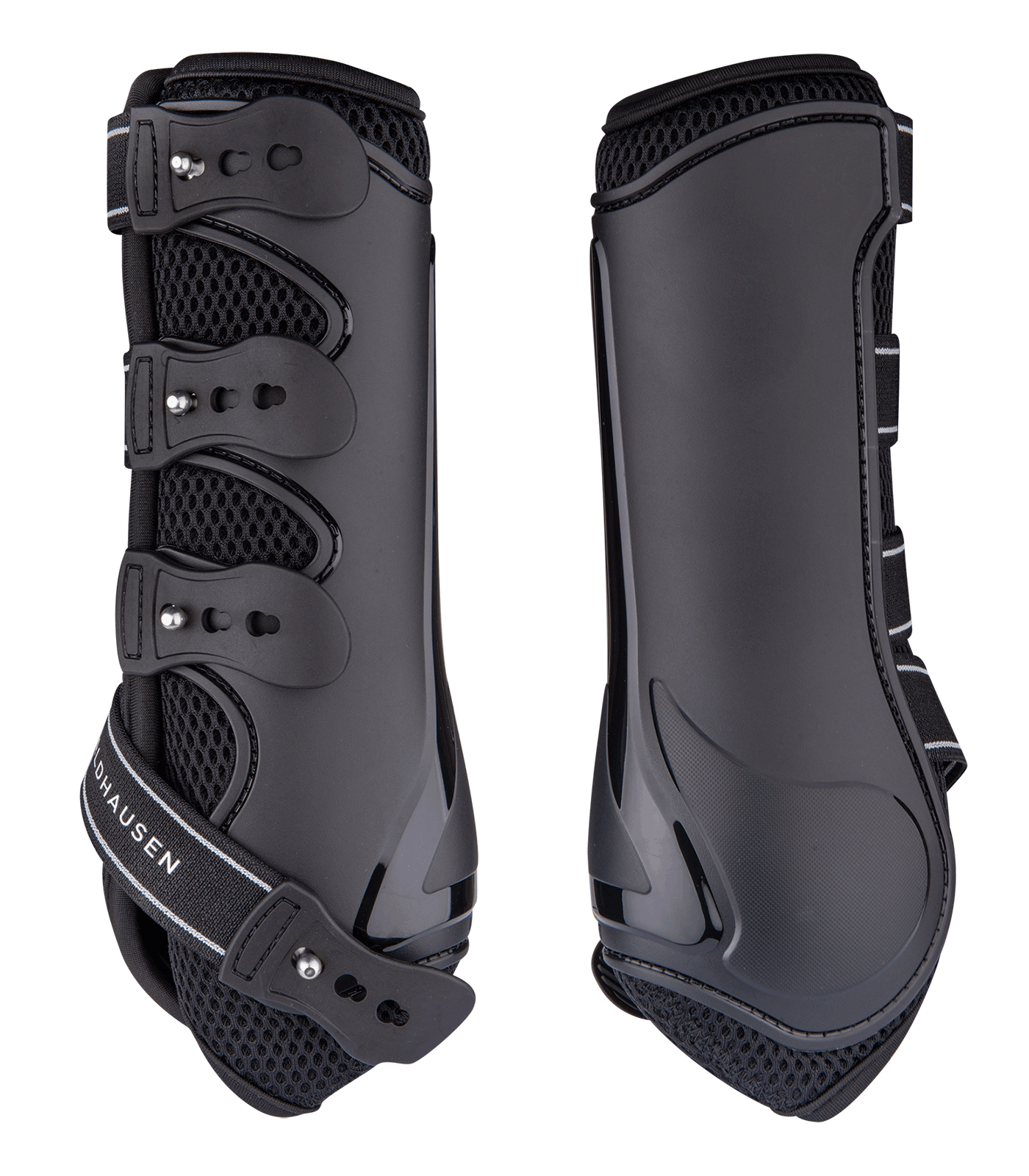 Casco exterior preformado antómicamente Absorbente de golpes y particularmente permeable al aire por un acolchado de red especial. Regulable en 3 posiciones mediante prácticas correas elásticas que se ajustan perfectamente a la pata del caballo. Set de un par Sobre colgador de cartón Waldhausen