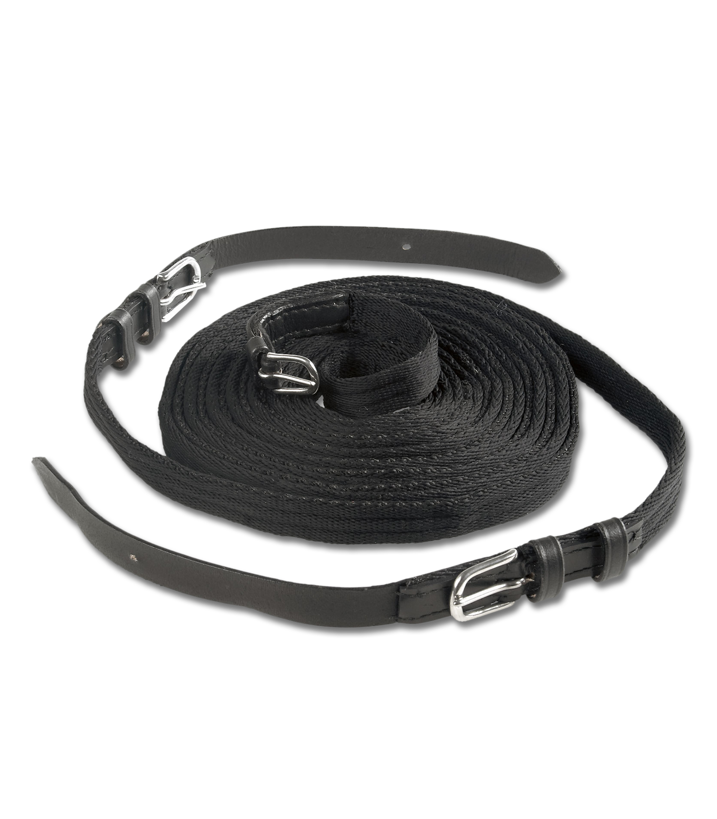 Riendas muy suaves y anatómicas para asegurar un excelente y cómodo agarre. Con refuerzo de cuero. Longitudes en total: PON = 720 cm VB = 840 cm WB = 900 cm Material de la cinta de tela: 100 % poliéster Color: negro