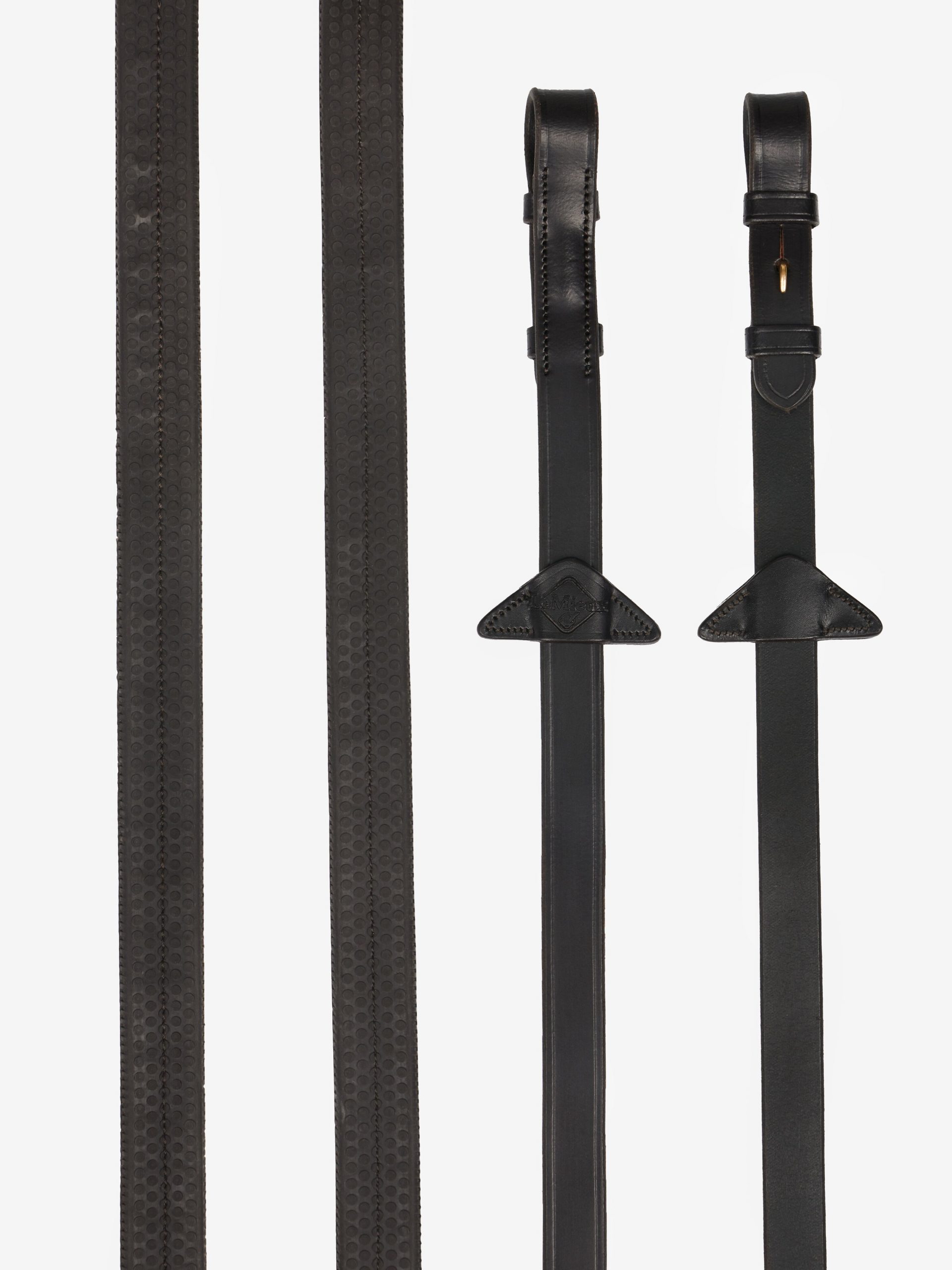 Las riendas de goma Lemieux son riendas prácticas que tienen una sensación de agarre ligero en las manos de los jinetes para adaptarse a cualquier piloto. Con textura antideslizante para un revestimiento adicional de agarre y nylon para evitar estiramiento. Complementado por los tapones de cuero de cuero de marca.
