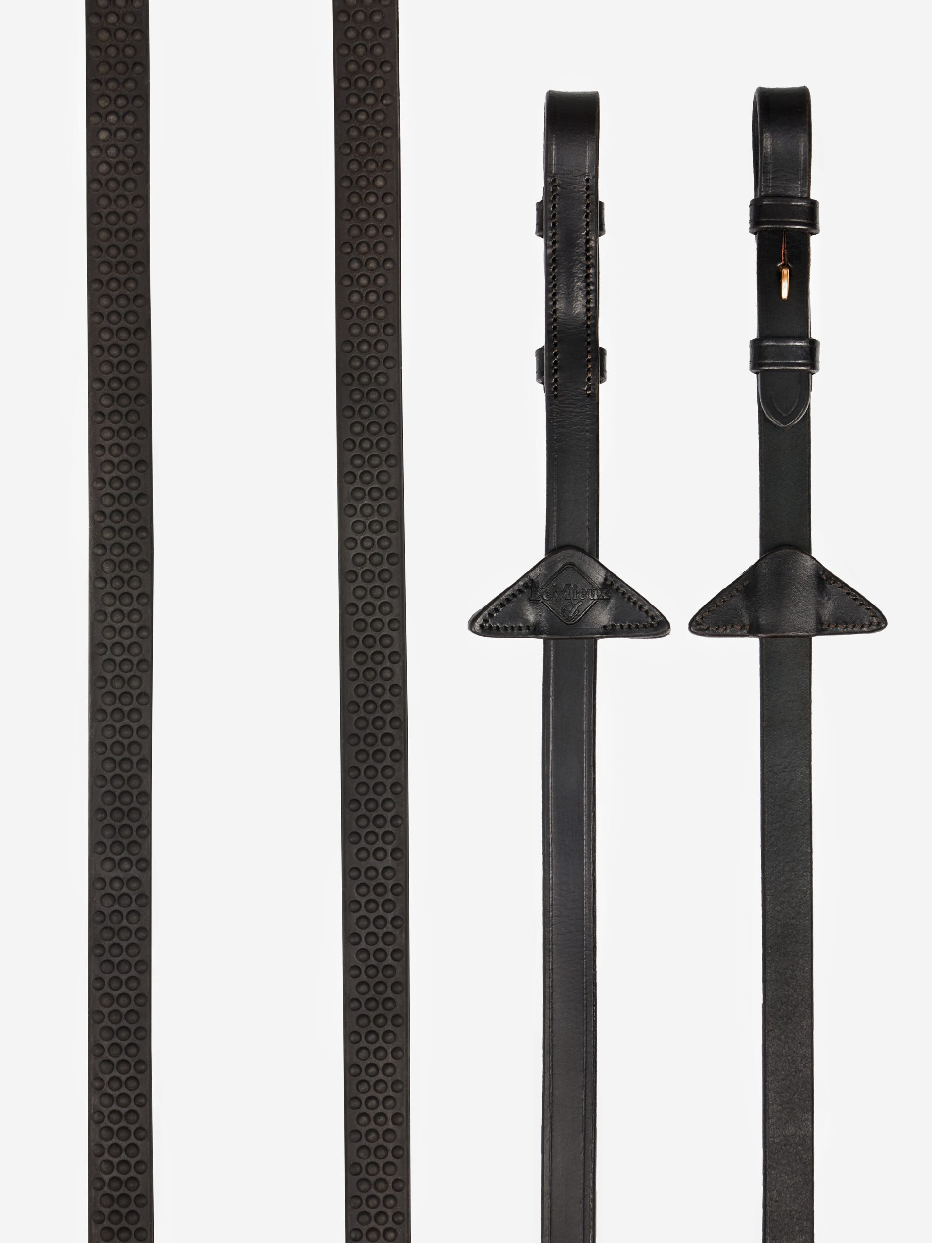 Las riendas de goma suave de Lemieux son riendas bellamente suaves y flexibles que tienen una sensación ligera en las manos del ciclista. Con textura de espinilla elevada para un forro adicional de agarre y nylon para evitar estiramiento. Complementado por los tapones de cuero de cuero de marca.