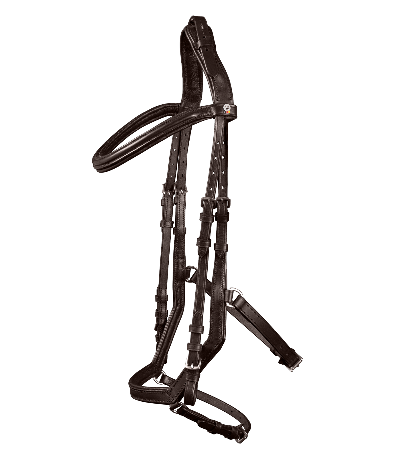 – Cabezada anatómica que garantiza un posicionamiento cómodo de la embocadura con efecto directo sobre los belfos y la lengua del caballo, para dar comandos claros – La muserola corta se coloca a la mitad del hueso nasal para minimizar el esfuerzo ejercido sobre los tractos nerviosos sensibles, los vasos sanguíneos y el área de los huesos nasales y cigomáticos – La correa complementaria en el área de las quijadas del caballo permite reducir el esfuerzo en las ramas maxilares inferiores – Testera con más espacio para las orejas y apertura en el centro para evitar la presión sobre la cinta de la nuca – Muserola y testera con suave revestimiento – Hebillas de acero inoxidable – Riendas de tela de 19 mm